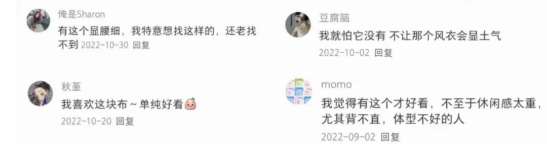 但品牌们虽然推出了各式各样的款式,却并没有征服所有消费者,有很多人压根就不希望风衣后面有这块布,无论它是什么形式。在小红书上,就有不少人吐槽这块“多余”的布料。不少网友表示这块布不光没什么用处,穿上之后还显得整个人特别臃肿,并且由于材质的问题,如果不打理,这块布能翘出千奇百怪的形状,让人看起来邋里邋遢。