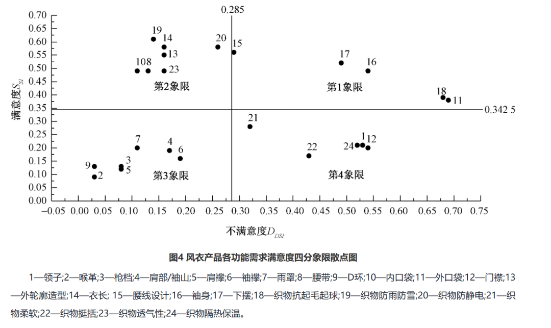 大连工业大学的穆芸副教授发表过的一篇文章就研究了消费者对于风衣各个组成部分的需求以及满意度。研究先获取消费者对风衣产品功能的需求,构建了风衣产品需求清单,然后通过问卷调研,得到风衣产品各功能需求归属分类、满意度四分象限散点图以及权重分布,结果如下图。